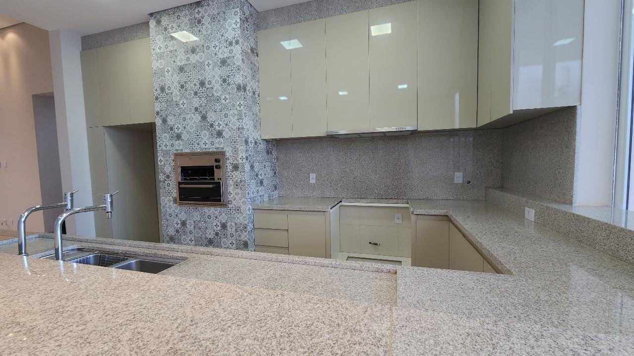 • cozinha mobiliada com balcão e roda branca em pedra, exaustor e churrasqueira e gás instalados