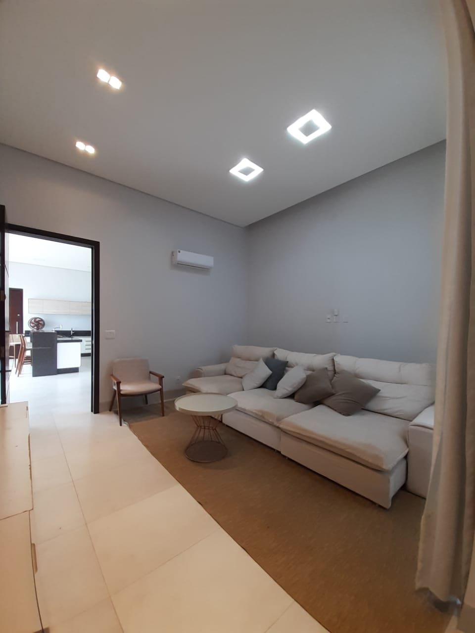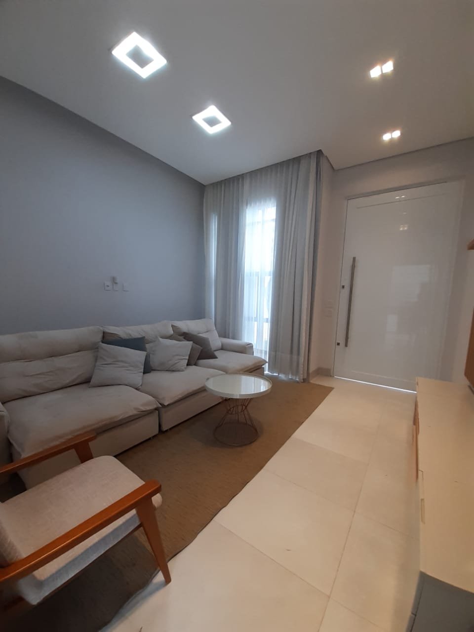 • Sofá grande, tapete, suporte de tv, cortina, cadeira e mesa de centro.